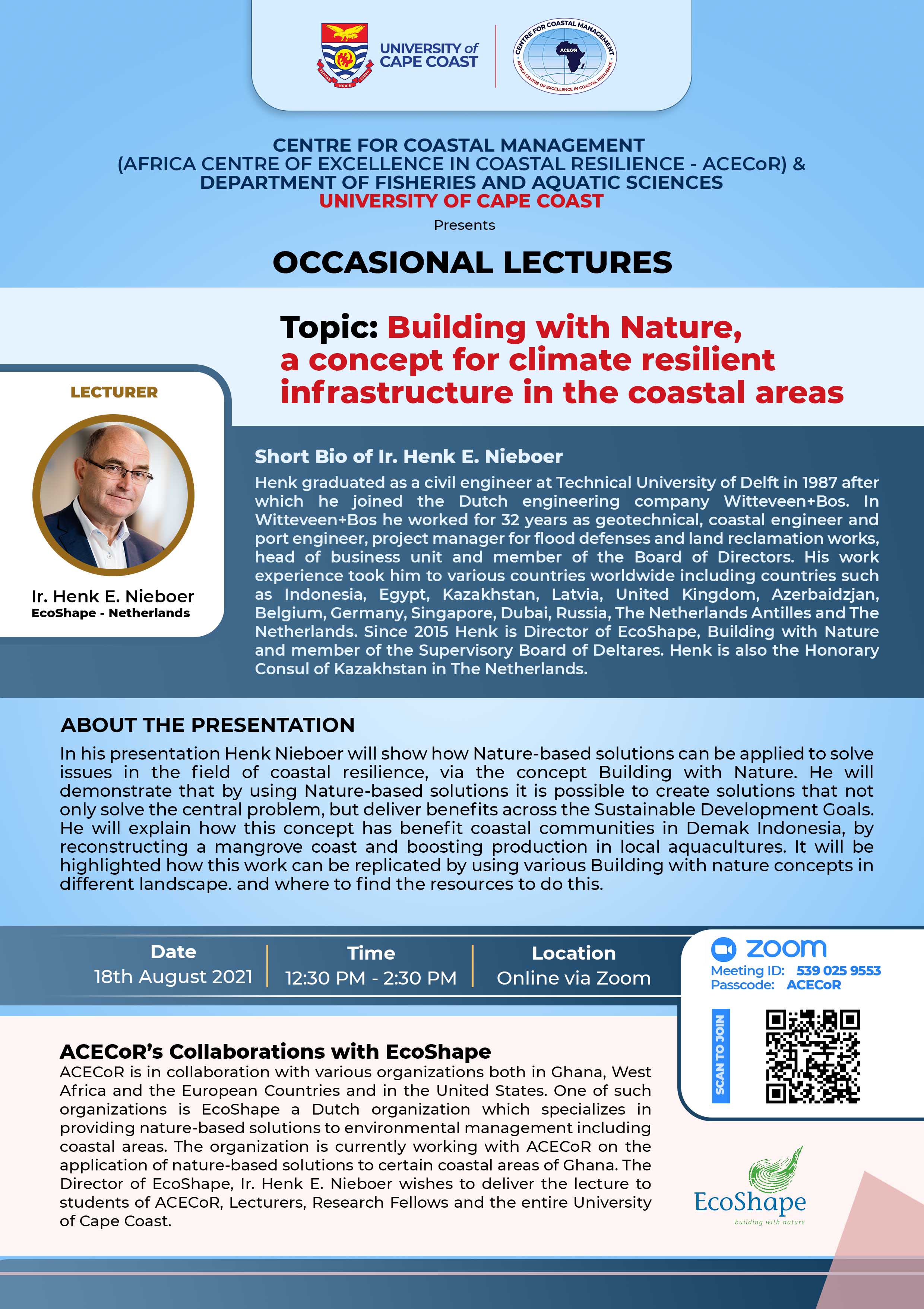 ACECoR is in collaboration with various organizations both in Ghana, West Africa and the European Countries and in the United States. One of such organizations is EcoShape a Dutch organization which specializes in providing nature-based solutions to environmental management including coastal areas. The organization is currently working with ACECoR on the application of nature-based solutions to certain coastal areas of Ghana. The Director of EcoShape, Ir. Henk E. Nieboer wishes to deliver the lecture to students of ACECoR, Lecturers, Research Fellows and the entire University of Cape Coast.