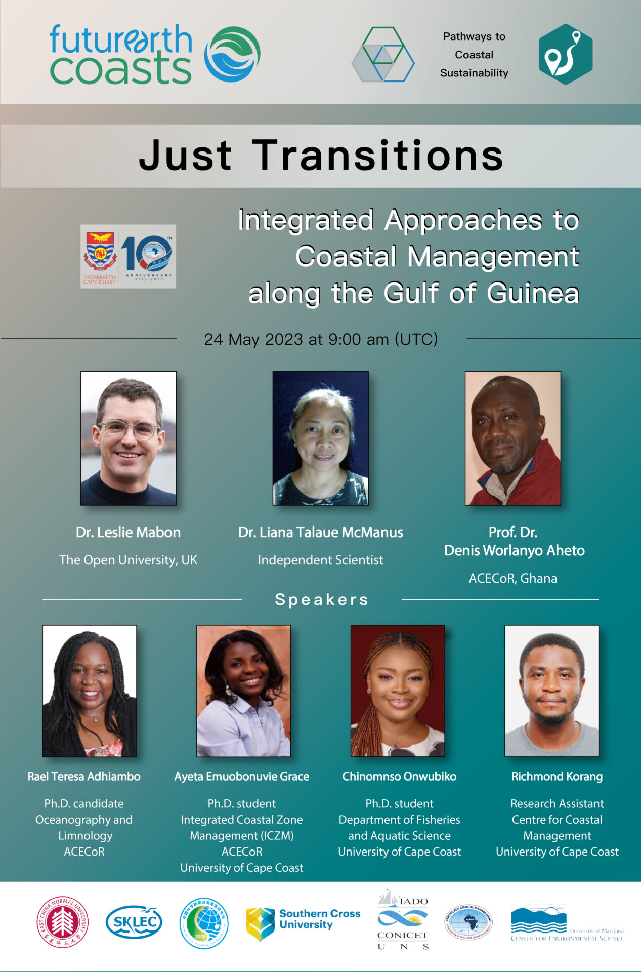 We are pleased to invite you, on behalf of the Future Earth Coasts (FEC) IPO China and IPO Ghana, to attend the special focus session of the FEC webinar series 'Just Transitions'. The theme is 'Integrated Approaches to Coastal Management along the Gulf of Guinea'. It will take place on 24 May at 9 am UTC.